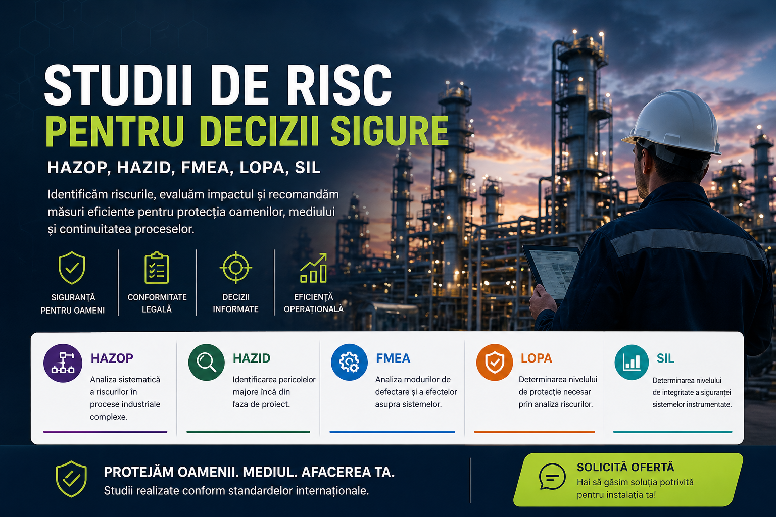 Alegerea corectă a studiului (HAZOP, HAZID, FMEA, LOPA, SIL) asigură controlul riscurilor, prevenirea incidentelor și funcționarea sigură a proceselor industriale.