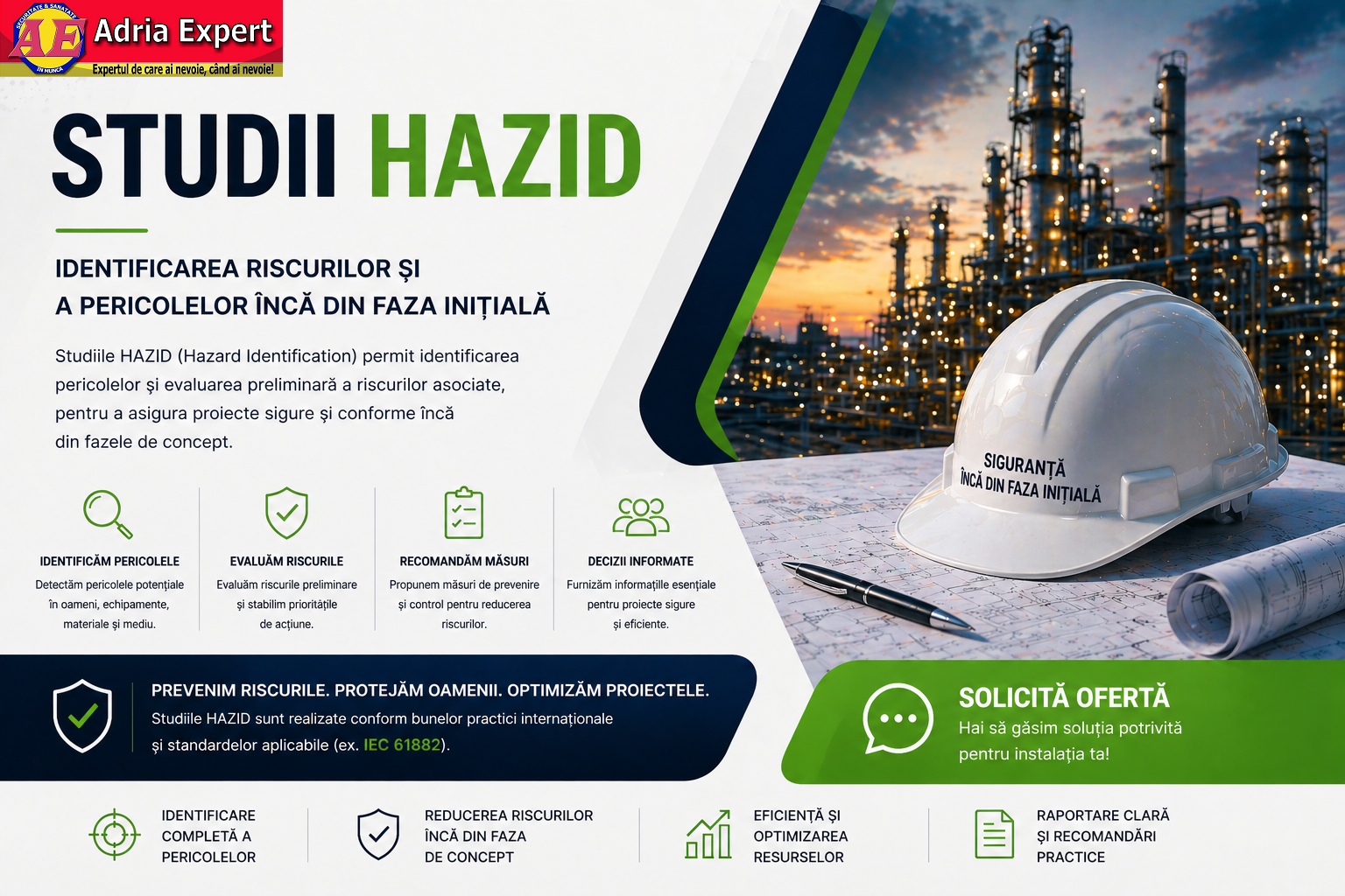 Realizăm studii HAZID pentru proiecte industriale, contribuind la reducerea costurilor și la creșterea nivelului de siguranță încă din etapa de proiectare.